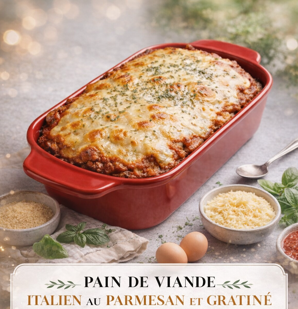 La cuisine italienne regorge de plats généreux et familiaux qui réchauffent la table. Parmi eux, le pain de viande au parmesan et gratiné au fromage est une recette simple, savoureuse et très appréciée pour les repas conviviaux. Inspiré des traditions italiennes, ce plat associe viande hachée, herbes aromatiques et fromage fondant pour un résultat à la fois tendre et gourmand. Facile à préparer, ce pain de viande est parfait pour un repas du quotidien mais aussi pour recevoir des invités. Le mélange de parmesan dans la préparation apporte une saveur intense tandis que la mozzarella gratinée sur le dessus crée une croûte fondante et légèrement dorée. Accompagné d’une salade verte, de légumes rôtis ou même de pommes de terre, il devient un plat complet et équilibré. Ce type de recette est également très apprécié parce qu’il peut être préparé à l’avance. Il suffit de le réchauffer quelques minutes au four pour retrouver tout son moelleux et son parfum méditerranéen. De plus, les ingrédients utilisés sont simples et faciles à trouver, ce qui en fait une recette idéale pour cuisiner maison sans complication. Dans cet article, découvrez comment réaliser facilement un délicieux pain de viande italien gratiné au parmesan, avec une préparation détaillée et quelques conseils pour obtenir une texture tendre et un gratin parfaitement doré.