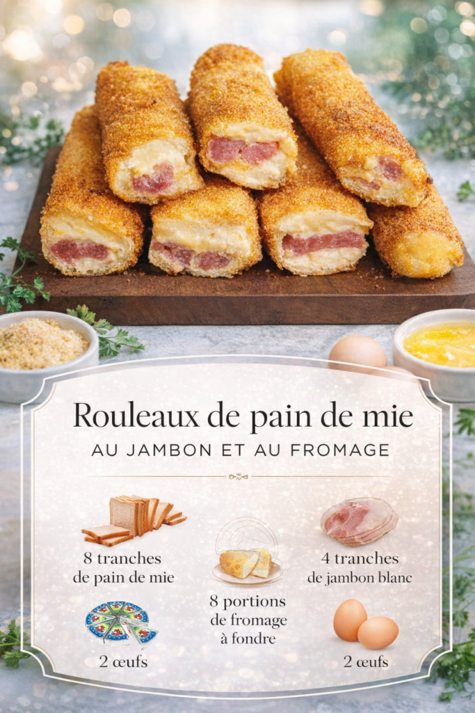 Les rouleaux de pain de mie au jambon et au fromage sont une idée simple et gourmande qui plaît aussi bien aux enfants qu’aux adultes. Cette recette facile transforme quelques ingrédients du quotidien en une collation chaude, croustillante à l’extérieur et fondante à l’intérieur. Parfaits pour un apéritif, un dîner rapide ou même un goûter salé, ces petits rouleaux sont rapides à préparer et très savoureux. Dans de nombreuses cuisines familiales, ce type de recette est apprécié parce qu’il permet de préparer un plat économique avec des ingrédients faciles à trouver. Le pain de mie devient ici la base d’un rouleau garni de jambon et de fromage fondant, puis pané et doré à la perfection. Le résultat est une texture irrésistible : une croûte croustillante qui renferme un cœur crémeux et chaud. Cette préparation rappelle les snacks maison populaires dans plusieurs pays européens. Elle peut également être adaptée selon les goûts : jambon de poulet, dinde, fromage à raclette, mozzarella ou même fromage frais. Il est aussi possible de cuire ces rouleaux à la poêle avec un peu de beurre ou de les frire pour obtenir une texture encore plus croustillante. Dans cet article, découvrez comment préparer facilement des rouleaux de pain de mie au jambon et fromage, une recette traditionnelle simple, rapide et parfaite pour un repas convivial ou un apéritif gourmand.
